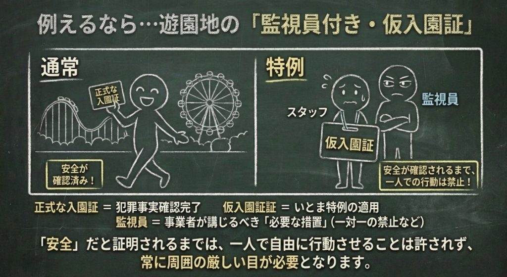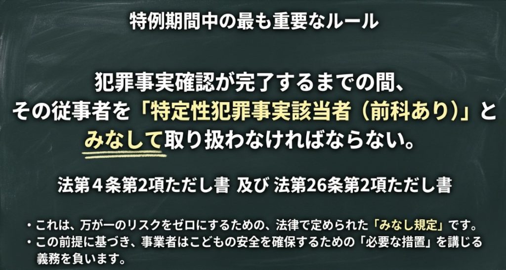 確認が完了するまでの間、その従事者は「特定性犯罪事実該当者(前科あり)」とみなして取り扱う必要があります。具体的には以下の措置が必要です。