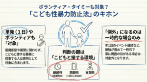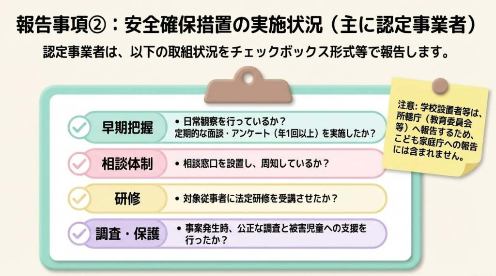 特に認定事業者(学習塾やスポーツクラブなど)は、照会結果だけでなく、日頃の「防犯体制」についても詳しく報告する義務があります。