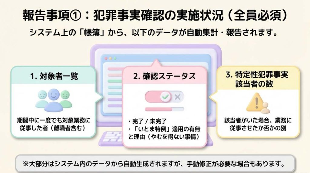 - 特定性犯罪事実の有無: 確認の結果、前科があった者の数と、それに対する措置(対象業務に従事させていないことの確認)。