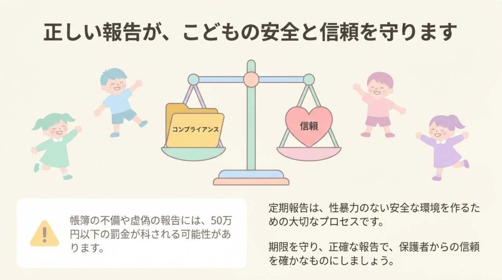 田畑定期報告は単なる事務作業ではなく、事業者様が「こどもにとって安全な場所である」ことを国に証明する大切な手続です。