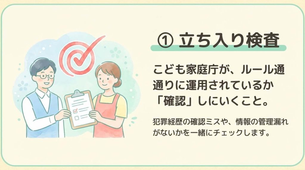 こども家庭庁は、必要な限度において事業者に対し、報告や資料提出を求めたり(報告徴収)、職員を施設に立ち入らせて帳簿や書類を検査したり、関係者に質問したりすることができます。これは、事前の予告なく行われる可能性も否定できません。