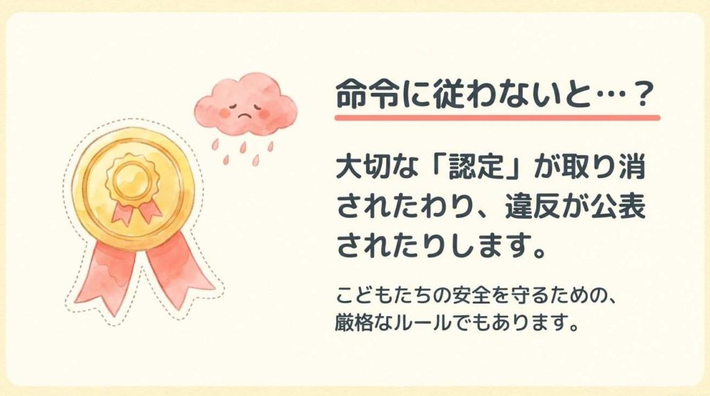 これらの命令に従わない間、国は新たな「犯罪事実確認書」の交付を停止します。これは新しいスタッフを一切採用できなくなることを意味し、現場の運営は事実上ストップしてしまいます。 さらに命令に従い続けなければ、最終的には認定の取消しという最も重い処分が下されます。