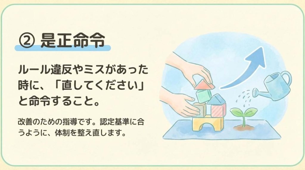 立入検査の結果、体制に不備が見つかれば、国から改善を促す強力な「命令」が出されます。こちらはお願いベースの行政指導とは違い、非常に強い強制力を持ちます。