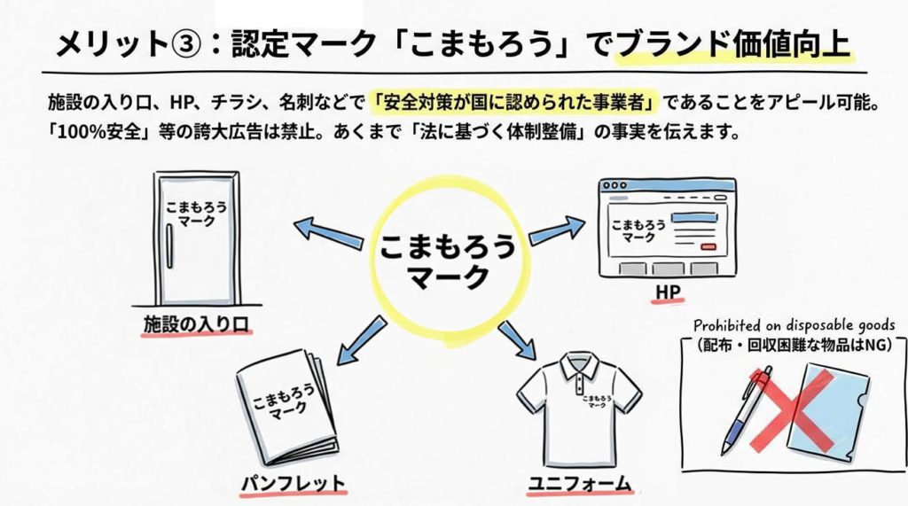 - 誇大広告の禁止: 「このマークがあれば100%安全」といった過度な表現は控え、あくまで「法に基づく体制を整備し、認定を受けた事業者である」ことを事実として伝えることが重要です。