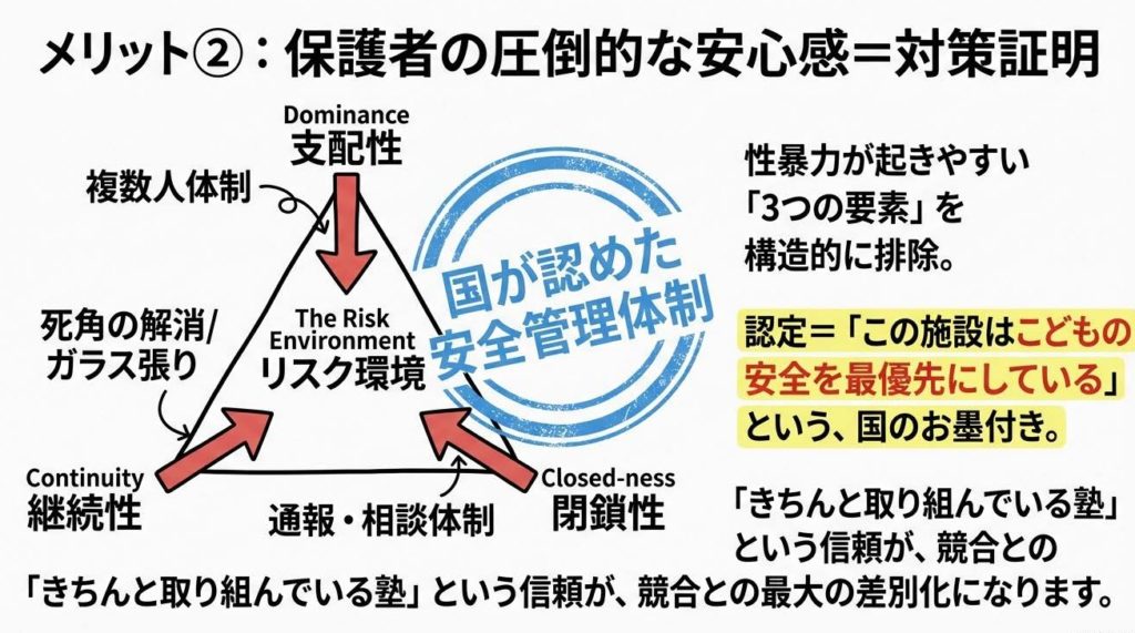 認定を受けるということは、性犯罪歴の確認(照会)だけでなく、これらのリスクを低減するための安全管理体制(指導時の複数人体制の確保や、死角の解消など)を国が認めたことを意味します。